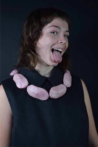 Tongues transformed mango pits into tongue-like wearable forms by moulding food-dyed waste leather around them to create a range of visceral, fleshy neckpieces and brooches. This series more directly addressed the research question, with wearers at the Re:mains interactive events (2019), organized and led by Colley, commenting on eating being “such a regular event, I’ve never begun to contemplate anything about it” possibly indicating that the wearing of such jewellery can encourage reflections on the everyday act of eating. A Tongues neckpiece was selected for Body Control an international exhibition at Arnhem Museum, The Netherlands, 2019 - 2020.